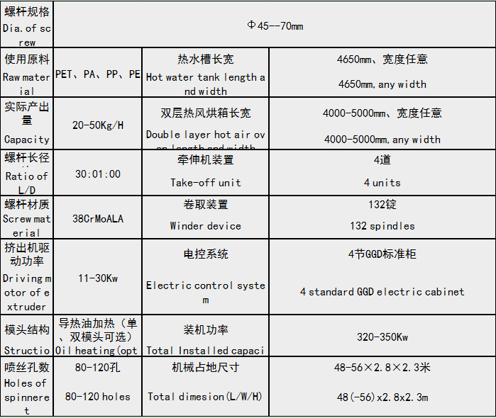 本机组可广泛应用于滤布、滤网、织带、筛网、渔网、毛刷、割草线等多个方面。适用原料PA6、PA66、1010、PET等,可生产单丝直径在0.08-3.0mm(约60-72000D)范围自由调节,生产的产品强力高,弹性好、断伸小。我们积极响应客户的特殊要求。