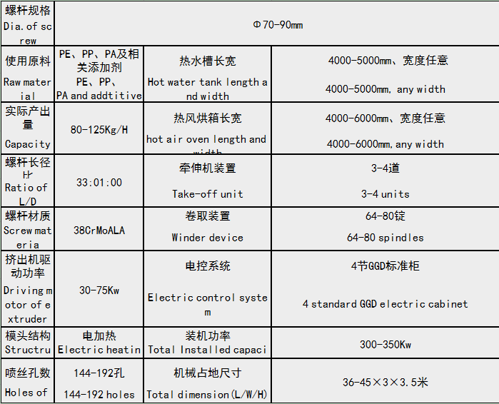 PE草坪丝拉丝机组专业生产草坪直丝、曲丝。该机组的主要技术指标已达到国际先进水平,其速度快、产量高、能耗低、丝筒成形质量好,整个机组结构紧凑、造型美观、运行平稳、控制灵敏可靠、制造工艺精良、操作方便、安全可靠。本机组适用范围广,可用于聚丙烯、高密度聚乙烯、线性低密度聚乙烯等塑性塑料的各种扁丝成型加工,主要用于编织袋、集装袋、土工布、人造草坪、地毯基布。