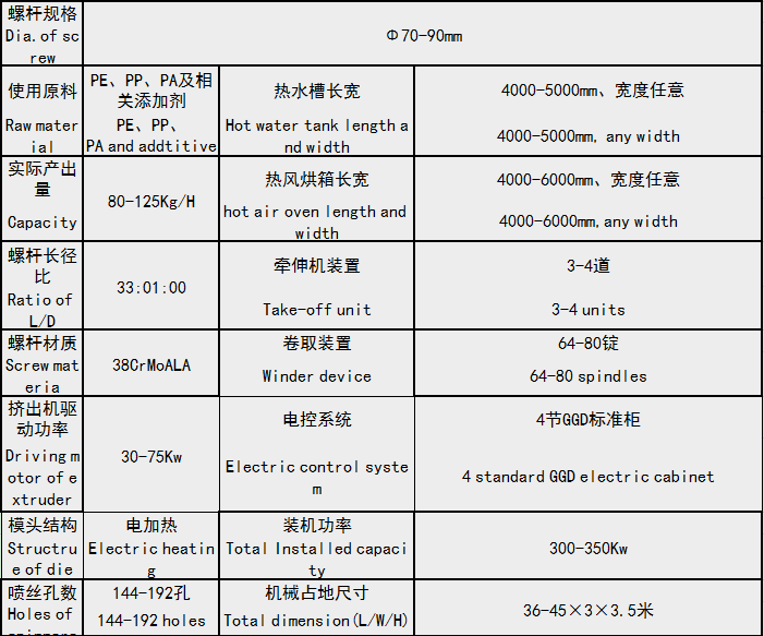 PE草坪丝拉丝机组专业生产草坪直丝、曲丝。该机组的主要技术指标已达到国际先进水平,其速度快、产量高、能耗低、丝筒成形质量好,整个机组结构紧凑、造型美观、运行平稳、控制灵敏可靠、制造工艺精良、操作方便、安全可靠。本机组适用范围广,可用于聚丙烯、高密度聚乙烯、线性低密度聚乙烯等塑性塑料的各种扁丝成型加工,主要用于编织袋、集装袋、土工布、人造草坪、地毯基布。